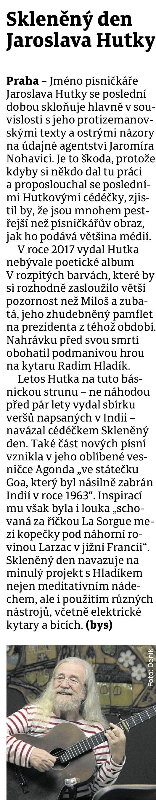 Krátce po politicky laděném albu 100 let vydalo nakladatelství Galén Jaroslavu Hutkovi novinku Skleněný den. Tentokrát si přijdou na své příznivci poetických obrazů, písní hýřících mnoha barvami, které – původně výtvarník – Hutka zařadil už na některá vlastním nákladem vydaná alba (Koncert v barvách Světlé, Duhová bublina) a také na předminulou galénovskou nahrávku V rozpitých barvách. Právě na toto album novinka navazuje osobou jednoho z Hutkových spolupracovníků, klasického hráče na violu Petra Přibyla. Jenže zatímco na Rozpitých barvách viola doplňovala kytaru Radima Hladíka a housle Jana Hrubého, na novince hrál Přibyl nejen roli hudebního režiséra a aranžéra, ale především pozval další hráče z orchestru Národního divadla v Praze. Jaroslava Hutku, který tentokrát netradičně pouze zpívá, tak doprovází – v různých kombinacích a konstelacích – devět hudebníků. V některých písních nástroje Hutkův zpěv pouze decentně podbarvují, přičemž důležitou roli hrají smyčce (viola, housle, violoncello). Jinde do celkového vyznění promlouvá elektrická kytara – nejvýrazněji v sólech v písni Normální den. Dalším (asi nejdiskutabilnějším) modelem je zapojení celé (folk)rockové rytmiky, která například do písně Letní den vpadne poněkud nečekaně a spíše než organickou kapelu Vlastimila Třešňáka připomeneme lehce umělý (nikoli však za každou cenu špatný) doprovod Karla Kryla na australském albu Dopisy. Protože má doprovod, který Petr Přibyl zvolil, bezmála tolik variant a podob jako Hutkova malířská paleta barev, převažuje pozitivní dojem z alba, na kterém se milostná témata střídají s obrazy plnými zvířat, svitu slunce a stínů. Zvláště melodické nástroje (mezi něž lze zařadit i výše zmíněná sóla elektrické kytary) podporují Hutkův zpěv a povyšují důvěrně známé a někdy lehce monotónní melodie Vladimíra Veita. Bluesové varhany v písni Setkání v neznámém těle jsou pak jen jedním z řady hudebních překvapení, která album přináší. UNI, Milan Tesař (Radio Proglas), VI/2019