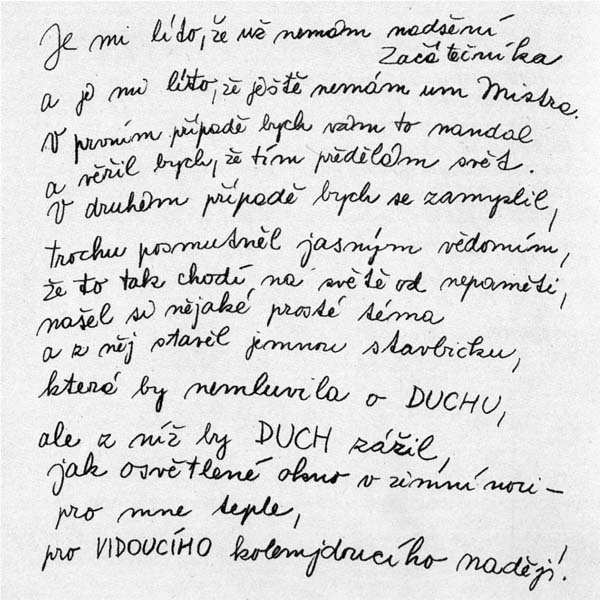 Jsem tvor trochu amuzikální, který se rozhodl, že mládí a život bude věnovat písňovému textu, a mám, na rozdíl od jiných, za to, že text je v písni podstatný a melodie má jen jakoby připomenout, že řeč není ani trochu hluchá a obvyklá. Přemýšlím často o slovech a výsledek mých úvah většinou vyústí v pocit zázraku. Slovo je podivným zvukem, který má hluboký obsah a význam, dokáže soukromé předestřít všem lidem najednou a to veliké obecné a objektivní zase znovu zasít do půdy intimního prožitku. Je jedinou možností, jak se lidé mohou mezi sebou jasně dorozumět.