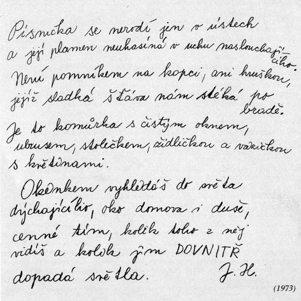 Život je dost krátký na to, abychom si v něm dovolovali přepych samolibosti. Mám mnoho co vyčítat profesionálním textařům, že příliš častým a necitlivým zacházením se slovy, a to mnohdy s těmi nejvzácnějšími, jako je LÁSKA, SEN, SMUTEK, ŠTĚSTÍ, RADOST..., nám je jaksi opotřebovali. Možná, že se tady trochu usmějí a pro sebe si řeknou: „Vždyť jde jenom o písničky." Ty dnes vznikají jako houby po dešti a mnohé sotva zazáří, už zhasínají, aby udělaly místo dalším. Nestačí ani uvíznout v srdci, aby nám někdy pošramocený cit opláchly zase do zářivé čistoty. Písnička lidová, jak ji dnes znám a poznávám, to ONO zajisté má a jak zjišťuji, nevyprchává to z ní jako vůně z květin. Život jejích neznámých tvůrců byl patrně těžší než náš dnešní. Mnohým zůstala víra nebo písnička. A podle množství zachovalých písniček a jejich rozvinutého slohu soudím, že častěji se uchylovali k písním, jistě také z přirozenosti společenské, ale určitě víc pro spásnou víru VYSLOVENÍ SE. Ten, kdo umí VYSLOVIT nebo POCHOPIT vyslovení, tomu se stává život jaksi snesitelnější a bližší nebo dokonce šťastnější, protože umí hlouběji pocítit jeho neobyčejnost. Další vzácná vlastnost onoho dávno zapadlého vesnického lidu byla potřeba slavit a pentlit. Narození, svatba, pohřeb i různé jiné události byly důvodem k tanci, vyšívání kroje, malování kraslic a truhlic, omalování stavení, obřadnosti, patetičnosti nebo rozjařenosti, ale hlavně ke zpěvu... Nebylo snad ničeho, co by nevyjádřili písní, a určitě každého dnešního literáta přivede k údivu, o kolika věcech a pocitech dokázali zpívat při jejich velice jednoduchém až schématickém písňovém jazyku. Písničky jsou si podobny jako stromy v lese, ale každá má - tak jako strom pro zkušeného znalce přírody - svoji jedinečnost a půvab. Pro mne je každá z nich dobrodružstvím, květinkou, která poznenáhlu kdesi ve mně vykvete nebo přesněji řečeno, dostanu ji, až si ji vysloužím. U každé z těch, které jsem dal na desku, si pamatuji okamžik, kdy ve mně zazářila v plné síle, a nebylo to nikdy doma, kde jsem písničku našel, zharmonizoval a třeba i vejskal nadšením nad báječností. Pokaždé to bylo na nějakém představení, kdy se mi z ničeho nic rozlouskla jako Popelčin oříšek. Nejintenzivněji si to pamatuji u písně „Láska neskončená", kterou jsem měl už dlouhjo v repertoáru; připadala mi „pouze" jako mistrovská ukázka už vyzrálého slohu. Bylo to v roce 1972, kdy jsem jel ochraptělý a s chřipkou hrát do Brna na Leninovy koleje. Bylo mi smutno, den pršlavý a škaredý, a já si připadal docela marný. Posadili mne za stůl a sesedli se okolo. Vlevo ode mne seděly holky, jako madonky od Botticeliho, vpravo hoch u magnetofonu, který si na papírek zapisoval akordy, a dál už jen obrysy lidí v šerosvitových barvách, přelazůrovaných cigaretovým kouřem. Nevím, kolik písniček jsem přehrál a kolik řečí napovídal, než jsem došel k písničce „Láska neskončená". Když jsem spustil „Vyšla děvčina, vyšla jediná...!", ponořil jsem se do písně jako do průzračné vody a najednou POPRVÉ! jsem uslyšel její text, který jsem už dávno znal nazpaměť. Cítil jsem, jak na mě sáhla docela živočišně, jako radost, která se někde uvnitř objeví a prosákne až na kůži, a člověk sedí nepohnutě, aby ji nezahnal, aby ji vychutnal, aby na sebe zapoměl a stal se jí. Melodie mi zněla jako holubice usmíření, její ladná křivka jako křivka letu ptáka na jasném nebi, podivný pocit první lásky, která často jako jediná je tím skutečným zábleskem PRALÁSKY, vztahu věcí k sobě samým podle vnitřního zákona... pocit dvou lidí minoucích se na ulici, kteří pouze stačí pochopit, že se NIKDY neobejmou...