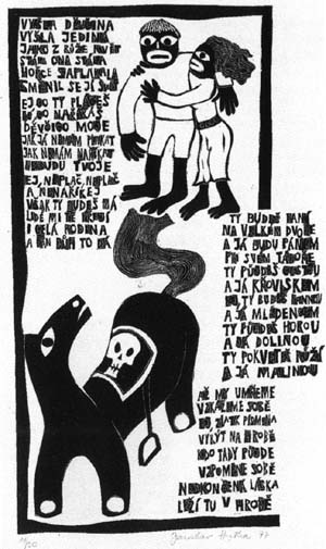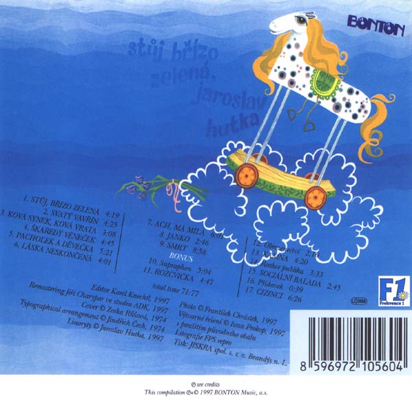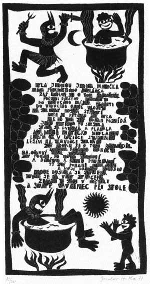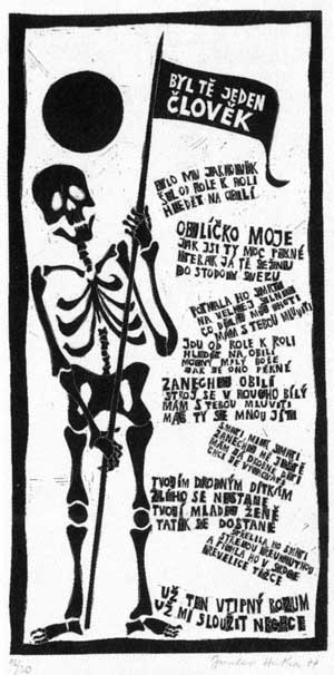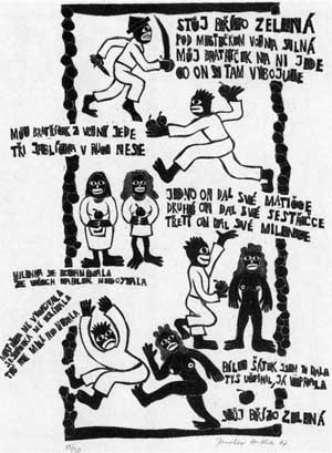 Druhou přílohu jsem udělal pouze obrázkovou. Bylo to osm linorytů, které mají na výšku více než půl metru, a měl jsem ještě před pár dny pochyby, jestli to zmenšením na velikost cédéčka neztratí svůj výtvarný smysl. Ivan Prokop z Bontonu mě přesvědčil, že ne. Tedy dobře. Tehdy tuto přílohu rovněž zamítli, zdála se jim "negroidní", ale o tom vyprávím v záznamu z tehdejší doby, který jsme k léto desce přistřihli. Ale je pravda, že jsem výtvarný doprovod chtěl mít blíže primitivnímu umění, abych tím rozbil tu hloupou pentličkovo-krojovou kýčařinu, která lidové písně od devatenáctého století provází.