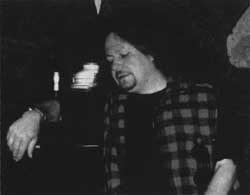 Hutka: Takže tenhleten rok byl takovej zvláštní v tom, že najednou jsem byl nuceném už žít jináč, už jsem byl v takový jako trochu emigraci, už jsem nevystupoval. A ten čas, já jsem byl zvykle ho trávit jináč. Najednou ten čas začal bejt nesmyslnej, neperspektivní, moje bejvalo žena z toho měla věčně hysterický záchvaty, že mě zavřou a co ona a že abychom šli pryč, že to tady stejně nemá cenu. Furt mě tahali k nějakej výslechům v Bartolomějský… Jeden závěr výslechu byl příjemnej. To jsem tam byl osmačtyřicet hodin, vytáhli mě potom z cely, ale nevedli mě k východu, ale zavedli mě do nějaké kanceláře, říkali k šéfovi. Tam seděl tlustém estébák a začal se mnou tak jako blahosklonně mluvit. A za chvíli vypadlo jako, oč jde. Začal