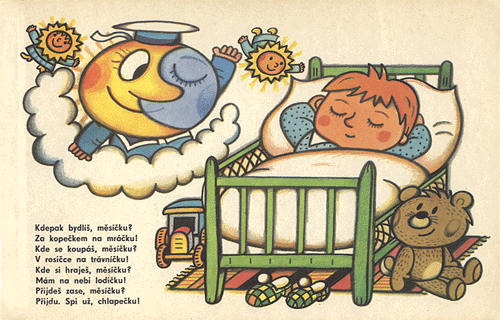 Kdepak bydlíš, měsíčku? Za kopečkem na mráčku! Kde se koupáš, měsíčku? V rosičce na trávníčku! Kde si hraješ, měsíčku? Mám na nebi lodičku! Přijdeš zase, měsíčku? Přijdu. Spi už, chlapečku!