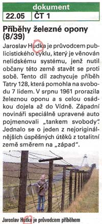 Jižní Morava - První díl cyklu Příběhy železné opony odvysílala včera Česká televize. Události natočené podle stejnojmenné knihy redaktora MF DNES Luďka Navary bude obrazovka nabízet dalších osmatřicet pondělních večerů. Představí v nich lidi, kteří se pokusili utéct z komunistického Československa, někdy úspěšně, jindy neúspěšně - to když skončili v žaláři nebo na hranici přišli o život.