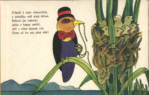 Přiletěl k nám rákosníček, V zobáčku měl zlatý klíček. Rákosí jím odemkl, jehlu z kapsy vytáhl, ušil z trávy domek nití. Dnes už ho má plný dětí!