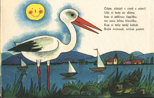 Čápe, zůstaň v zimě s námi! Ušij si boty ze slámy, kup si pěknou čepičku na svou bílou hlavičku. Kup si taky teplý kabát. Bude mrznout, snížek padat.