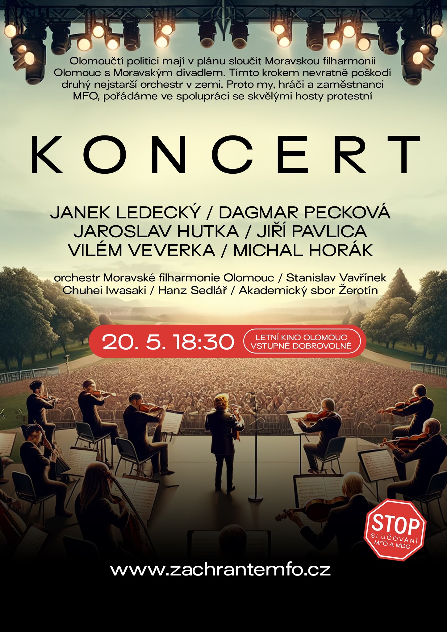 Odborářská kampaň bojující proti sloučení Moravské filharmonie Olomouc a Moravského divadla pokračuje protestním koncertem. Ten se uskuteční v pondělí 20. května od půl sedmé večer v prostorách olomouckého letního kina. Druhou nejstarší tuzemskou filharmonii přijede podpořit mezzosopranistka Dagmar Pecková, hobojista Vilém Veverka, houslista a skladatel Jiří Pavlica i osobnosti populární hudby.